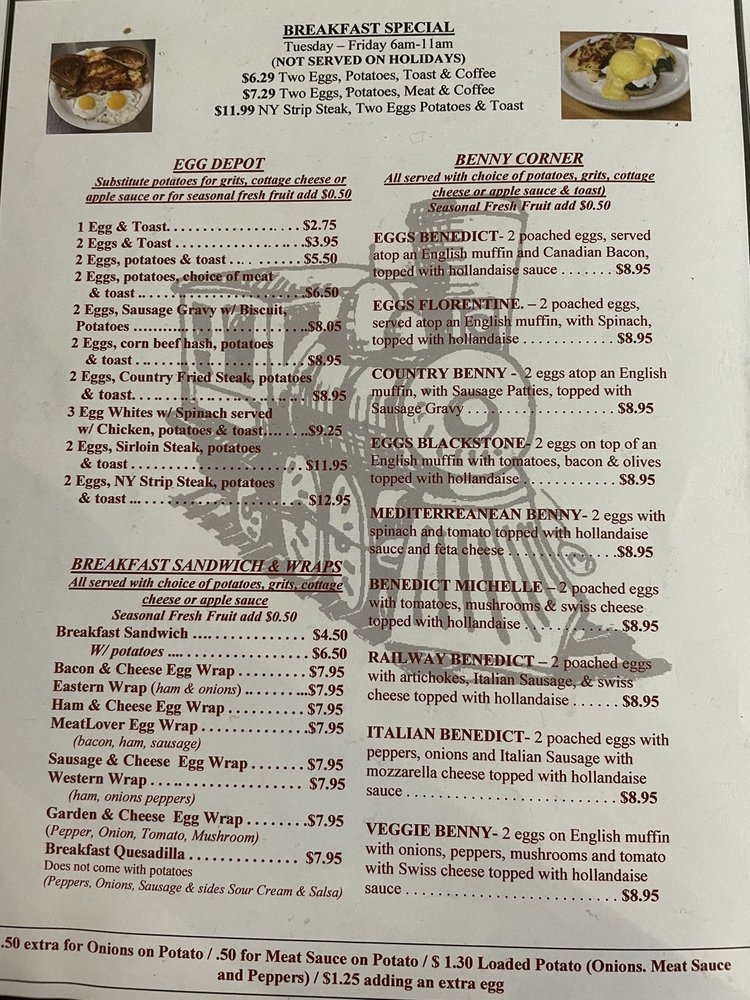 Welcome to the Railway Station Diner, a charming spot nestled in Rochester, NY, where breakfast and brunch come alive in a delightful atmosphere. The menu showcases a variety of offerings that cater to every palate. Start with tempting appetizers like crispy Chicken Fingers and gooey Mozzarella Sticks, both priced at just $5.95.